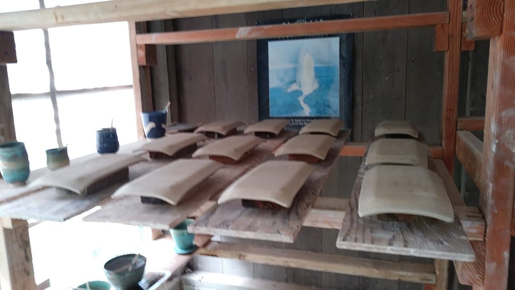 Rainy day – pottery drying slowly. Molded previously rolled out slabs in to sushi plates and trimmed soup bowls thrown on May 1.