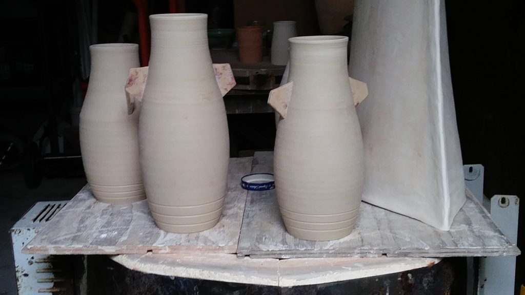 Trimmed large vases and kitchen utensil holders. Attached “ears” to vases.
