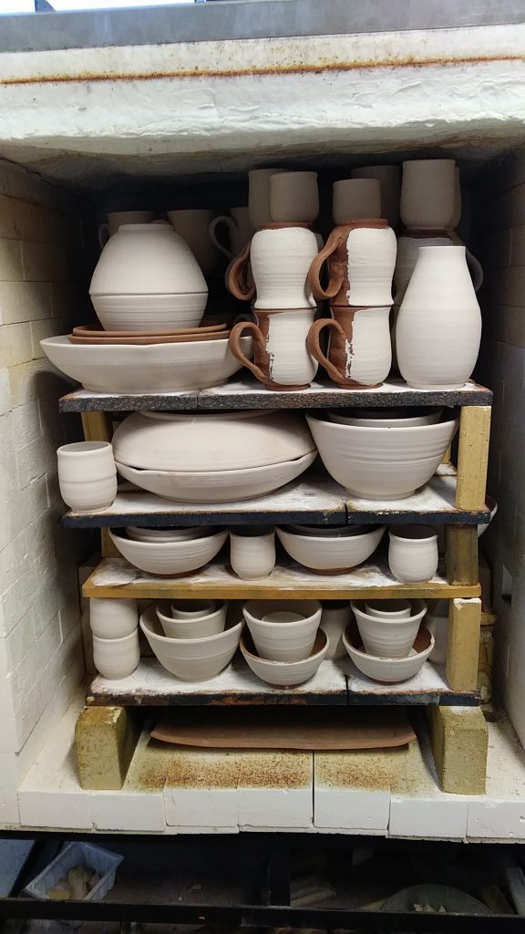 Loaded the Bailey bisque kiln for a firing tomorrow. Mugs weren’t completely dry so I’ll fire slowly.